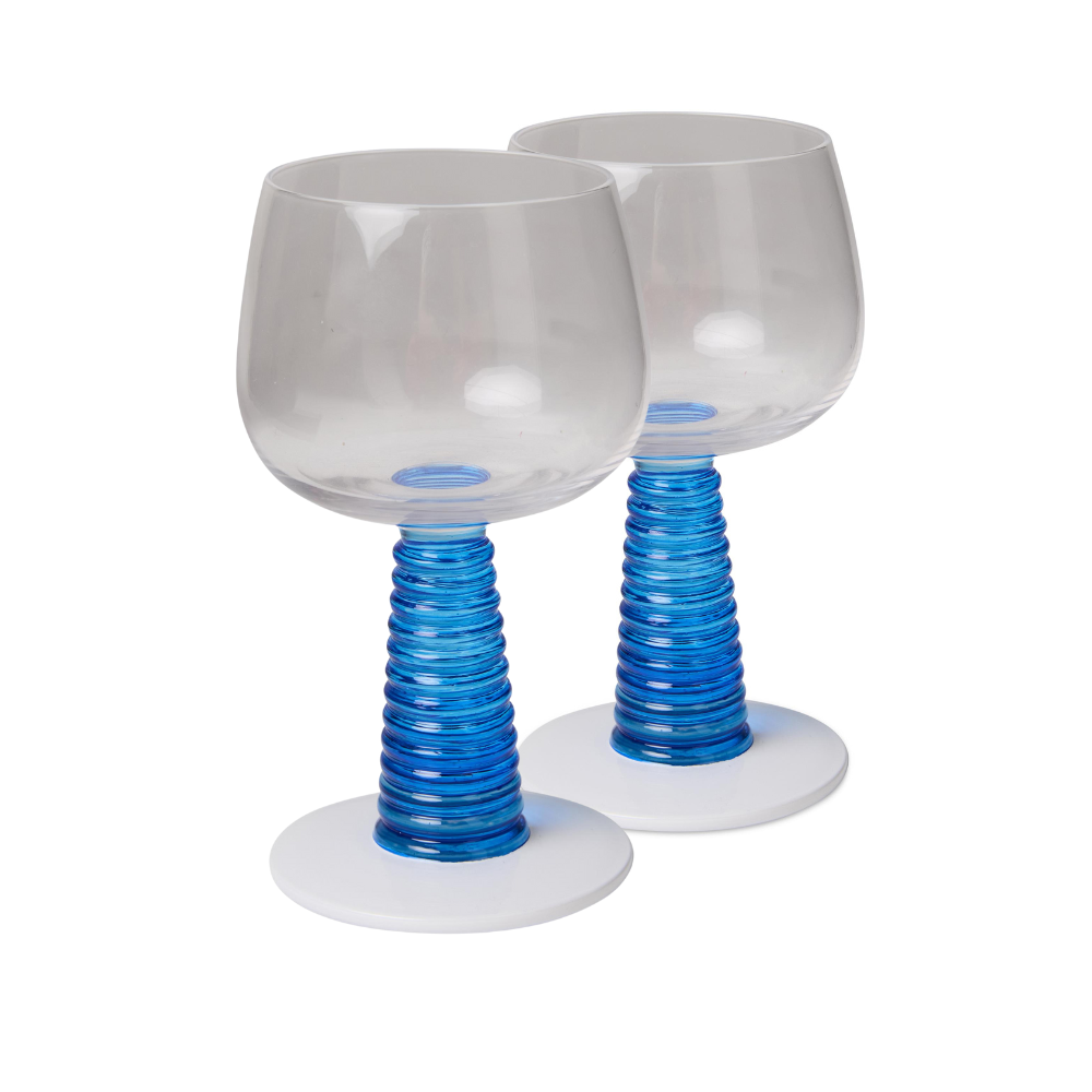 This Milos Luncheon Cocktail Glass features two clear wine glasses with striking blue and white stalk stems.